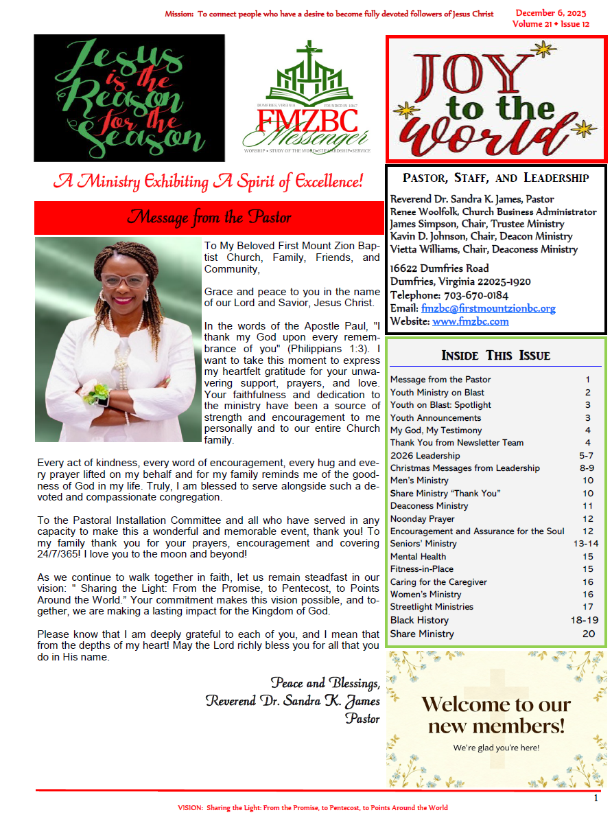 Inputs for the January 2026 Messenger are due by December 15, 2025. Coordinate with CPM1@FirstMountZionBC.org
